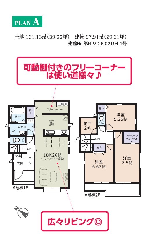 | 間取 | 3SLDK~4SLDK + リビング収納・フリーコーナー・WIC (LDK20帖、洋室7.5帖、洋室6.62帖、洋室5.25帖、S2帖) | ||