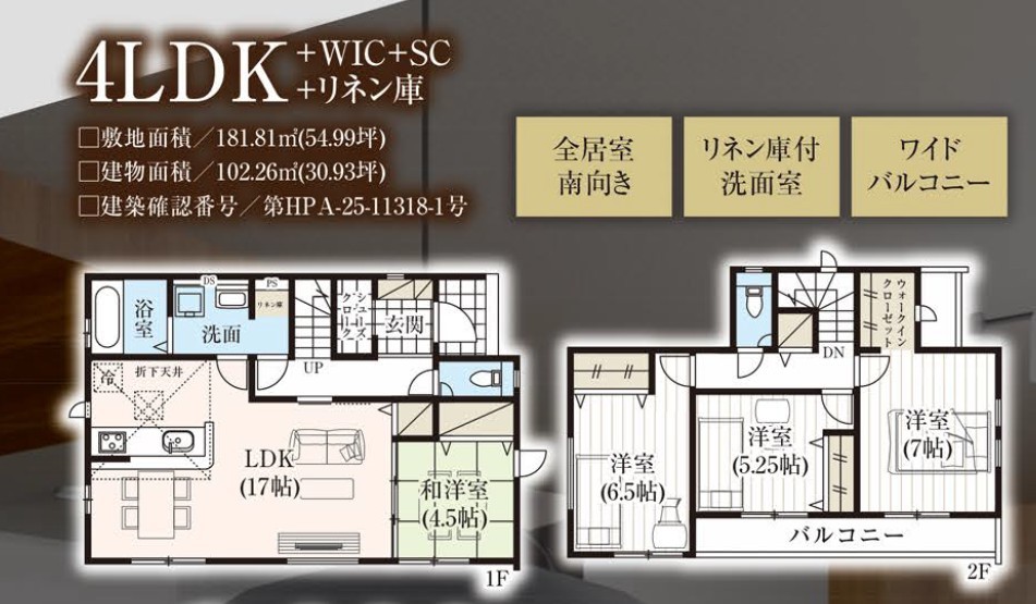 | 間取 | 4LDK + WIC・SIC・リネン庫・リビング収納・2階ホール収納 (LDK17帖、和室4.5帖、洋室7帖、洋室6.5帖、洋室5.25帖) | ||