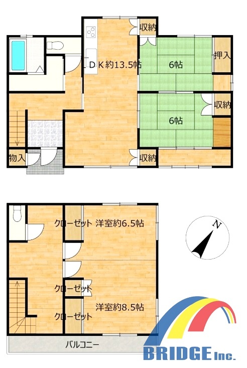 | 間取 | 4LDK + 駐車1台可能・庭・ワイドバルコニー (LDK13.5帖、和室6帖、和室6帖、洋室8.5帖、洋室6.5帖) | ||