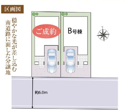 南向きの前面道路は広々6m、車の出入りもゆったりです。